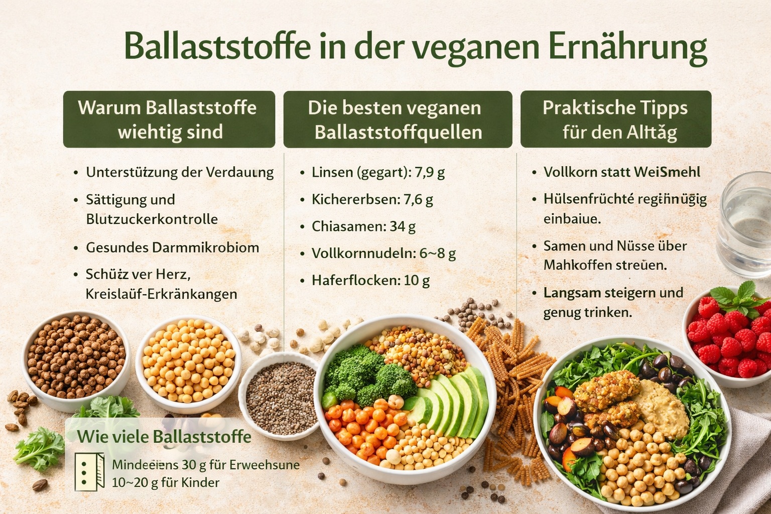 Ballaststoffe sind ein zentraler Bestandteil jeder gesunden veganen Ernährung. Sie fördern Verdauung, Sättigung, Blutzuckerkontrolle, Darmflora und Herzgesundheit. Mit abwechslungsreichen Lebensmitteln, einfachen Tricks im Alltag und einer bewussten Mahlzeitenplanung kannst du deinen täglichen Bedarf leicht decken.